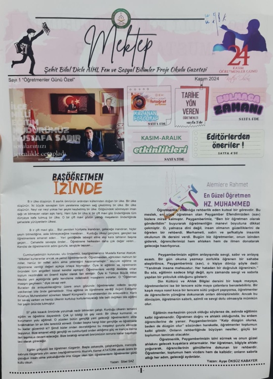 24 Kasım Öğretmenler Gününü; İlçe Milli Eğitim Müdürümüz, kurum amirleri ve öğretmenlerimizin katılımlarıyla Dicle Halk Eğitim Merkezi'nde kutladık. Programımız; İlçe milli eğitim müdürümüz sayın Mustafa Sabır' ın günün anlam ve önemini belirten konuşmasıyla başladı. Ardından öğrencilerimizin okuduğu şiirlerle devam etti. Daha sonra öğrencilerimizin hazırladığı "Öğretmen Olmak" adlı tiyatro oyunu sergilendi. Programımız; sinevizyon gösterisi ve yine öğrencilerimizin sergilediği halk oyunu ve şarkılarla devam etti. Program sonunda ilçemizdeki adaylığı kalkan öğretmenlerimizin yemin töreni gerçekleşti. Ayrıca tüm katılan davetlilere Dicle'de bir ilk olan okul gazetemiz dağıtıldı.